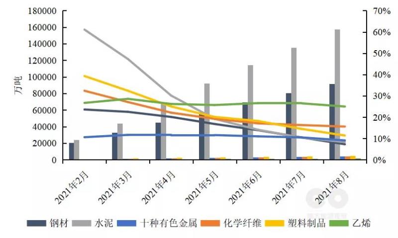 疫后經(jīng)濟(jì)復(fù)蘇,宏觀政策持續(xù)加碼推動(dòng)“新基建”快速部署,釋放經(jīng)濟(jì)增長(zhǎng)活力。2021年9月高技術(shù)制造業(yè)PMI為54%,較上個(gè)月增長(zhǎng)0.3個(gè)百分點(diǎn),高技術(shù)制造業(yè)增加值同比增長(zhǎng)22.6%,1-8月集中電路、光電子器件、微型計(jì)算機(jī)設(shè)備累計(jì)產(chǎn)量同比增長(zhǎng)48.2%、36.2%、34%(圖1)。2021年1-8月“新基建”熱潮帶動(dòng)傳統(tǒng)基建穩(wěn)固提升,1-8月累計(jì)固定資產(chǎn)投資和房地產(chǎn)投資同比增速分別為8.9%和10.9%,鋼材、水泥累計(jì)產(chǎn)量同比增長(zhǎng)分別為7.3%、8.3%。隨著國(guó)民經(jīng)濟(jì)穩(wěn)定恢復(fù),我國(guó)工業(yè)生產(chǎn)總體穩(wěn)定,2021年1-8月工業(yè)累計(jì)增加值同比增長(zhǎng)13.1%。儲(chǔ)能、光伏等新能源產(chǎn)業(yè)鏈蓬勃發(fā)展,短期內(nèi)帶動(dòng)高耗能行業(yè)主要產(chǎn)品產(chǎn)量強(qiáng)勢(shì)反彈,2021年1-8月十種有色金屬、化學(xué)纖維、塑料制品、乙烯累計(jì)產(chǎn)量同比增長(zhǎng)分別為9.1%、15.6%、11.4%、25%(圖2)。