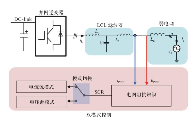 對(duì)比以上介紹的電流源模式和電壓源模式的并網(wǎng)逆變器控制穩(wěn)定性可知,二者的差異性本質(zhì)上是由于采用了不同的控制結(jié)構(gòu)導(dǎo)致的,使得并網(wǎng)逆變器對(duì)電網(wǎng)呈現(xiàn)出不同的外特性,從而在電網(wǎng)阻抗強(qiáng)弱變化時(shí),產(chǎn)生了一定的“互補(bǔ)”特性。即電流源模式并網(wǎng)逆變器適用于強(qiáng)電網(wǎng),而弱電網(wǎng)穩(wěn)定性下降,在極弱電網(wǎng)下甚至不能穩(wěn)定運(yùn)行;與之相反,在極弱電網(wǎng)和弱電網(wǎng)下的電壓源模式并網(wǎng)逆變器具有較好的穩(wěn)定性,而在強(qiáng)電網(wǎng)下系統(tǒng)則不穩(wěn)定。因此,文獻(xiàn)[3,70-72]提出了基于電網(wǎng)阻抗自適應(yīng)的雙模式控制,如圖6所示。在強(qiáng)電網(wǎng)下并網(wǎng)逆變器采用電流源模式,極弱電網(wǎng)下則切換到電壓源模式,綜合了兩種并網(wǎng)模式的優(yōu)點(diǎn),有效提升了單臺(tái)逆變器的電網(wǎng)阻抗適應(yīng)性,但是卻未涉及雙模式控制擴(kuò)展到多逆變器系統(tǒng)時(shí)的穩(wěn)定性問題。在文獻(xiàn)[3]的基礎(chǔ)上,文獻(xiàn)[12]將雙模式控制應(yīng)用到多逆變器系統(tǒng),提出多逆變器系統(tǒng)由全電流源模式切換到混合模式,使得系統(tǒng)同時(shí)有電流源模式和電壓源模式的并網(wǎng)逆變器,提升了弱電網(wǎng)下的并網(wǎng)逆變器穩(wěn)定性。然而,文獻(xiàn)[12]缺少對(duì)全電流源模式和混合模式切換邊界的定量分析,也未考慮電網(wǎng)進(jìn)一步變?nèi)鯐r(shí)混合模式系統(tǒng)是否仍舊穩(wěn)定的問題?;诖?,文獻(xiàn)[73]進(jìn)一步提出了基于電網(wǎng)阻抗自適應(yīng)的雙模式組合控制策略,將多逆變器系統(tǒng)從混合模式切換到全電壓源模式,從而保證了極弱電網(wǎng)下的系統(tǒng)仍舊有足夠的穩(wěn)定裕度。特別地,該文獻(xiàn)基于D分割法[74-76],研究了在幅值裕度、相位裕度和系統(tǒng)帶寬等多性能指標(biāo)約束下的參數(shù)穩(wěn)定域,得出了SCR大幅波動(dòng)情況下全電流源模式、混合模式和全電壓模式之間的定量切換邊界。
