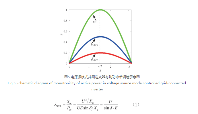 根據(jù)式(1)可知單調(diào)邊界對(duì)應(yīng)的功角為π/2。帶入式(1)所示的SCR公式,且通過加入無功功率支撐使得E=U,可得此時(shí)對(duì)應(yīng)的SCR為1,根據(jù)實(shí)際物理系統(tǒng)中SCR的定義可知,SCR不會(huì)小于1,因此,電壓源模式并網(wǎng)逆變器在更弱的電網(wǎng)下仍能夠穩(wěn)定運(yùn)行[3]。