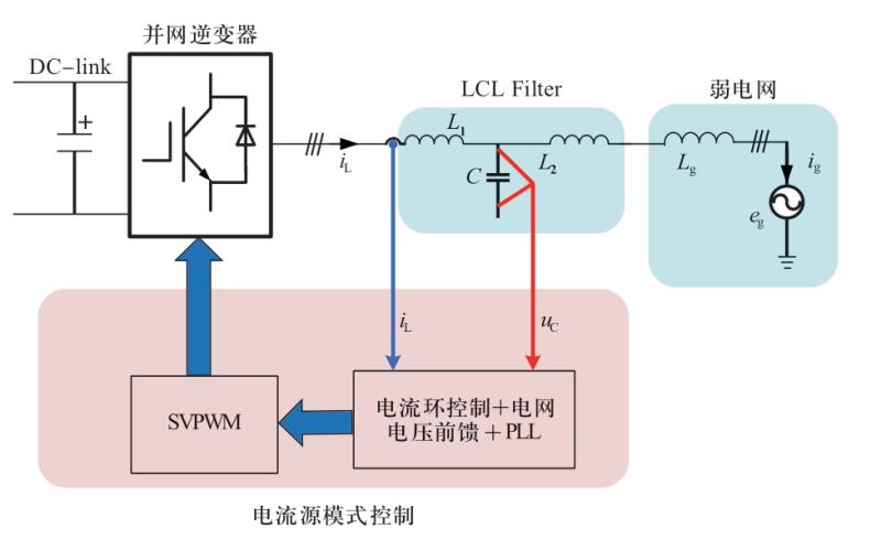 并網(wǎng)逆變器主要采用基于鎖相環(huán)(phase-locked loop,PLL)控制的電網(wǎng)電壓定向方案[10-11],該控制方式下并網(wǎng)逆變器可等效為一個(gè)電流源[3,12],稱為電流源模式,如圖2所示。PLL是一種結(jié)構(gòu)簡單,強(qiáng)電網(wǎng)下性能穩(wěn)定的并網(wǎng)同步單元。從圖2可見,電流源模式并網(wǎng)逆變器除了需要PLL外,通常還采用電網(wǎng)電壓前饋,以提升并網(wǎng)逆變器在電網(wǎng)電壓發(fā)生擾動(dòng)情況下的動(dòng)態(tài)響應(yīng)性能,并抑制由于電網(wǎng)電壓背景諧波引起的電網(wǎng)電流諧波等問題。