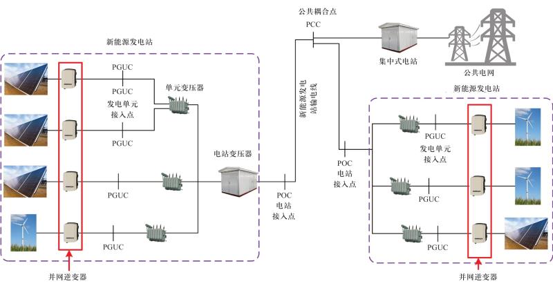 典型的高滲透率新能源并網(wǎng)發(fā)電系統(tǒng)如圖1所示。新能源通過并網(wǎng)逆變器接入新能源發(fā)電單元接入點(diǎn)(point of generating unit connection,PGUC),多個(gè)新能源發(fā)電單元通過電站變壓器匯集到電站接入點(diǎn)(point of connection,POC),然后多個(gè)新能源發(fā)電站再通過輸電線路匯集到公共耦合點(diǎn)(point of common coupling,PCC)。從圖中可以看出,不論是太陽能或風(fēng)能,都必須經(jīng)過并網(wǎng)逆變器才能實(shí)現(xiàn)并網(wǎng)發(fā)電??梢姡⒕W(wǎng)逆變器是新能源發(fā)電必不可少的關(guān)鍵環(huán)節(jié),承擔(dān)著能量高效轉(zhuǎn)換的關(guān)鍵任務(wù)。并網(wǎng)逆變器與電網(wǎng)的聯(lián)接與交互是影響新能源并網(wǎng)發(fā)電系統(tǒng)穩(wěn)定、高效運(yùn)行的關(guān)鍵因素。