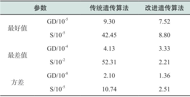 本文利用代距(generational distance,GD)和間距(spacing,S)兩個指標判斷傳統(tǒng)與改進遺傳算法的優(yōu)劣[23],其中GD表示算法的收斂性;S表示算法的分布性。分別對ZDT1函數(shù)隨機運行20次,對兩指標進行計算和統(tǒng)計。