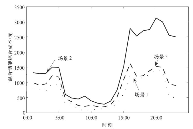 與場景2相比,場景5聯(lián)絡線功率方差雖略偏大,但是能夠獲取較高的收益。在00:00—5:00、19:00—24:00時間段,成本呈上升趨勢,這是因為沒有RES出力,HESS開始放電為負荷提供有功功率支撐。系統(tǒng)在8:00—15:00時間段,微電網(wǎng)負荷以RES為主、儲能為輔供給,所以成本變化基本平穩(wěn)。在6:00—7:00、16:00—18:00時間段,RES提供系統(tǒng)的負荷需求和HESS的充放電功率,多余出力會倒送到大電網(wǎng)中,所以成本會有下降趨勢。