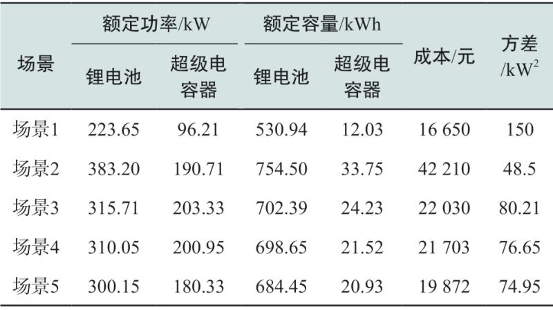 從表2可以看出,場景3、4和5均可以有效地求解多目標優(yōu)化問題,找到滿足約束條件下的最優(yōu)解。從HESS的經(jīng)濟性來看,由于場景5配置的功率和容量更少,所以成本更低,較場景3節(jié)省了2158元,較場景4節(jié)省了1831元。從平抑聯(lián)絡線功率波動來看,場景5的方差會低于場景3、4。仿真結果驗證出非合作博弈優(yōu)化方法能夠得到穩(wěn)定的Nash均衡解,不受主觀因素和博弈次數(shù)的影響,且可證明本文所提方法的有效性和最優(yōu)性。