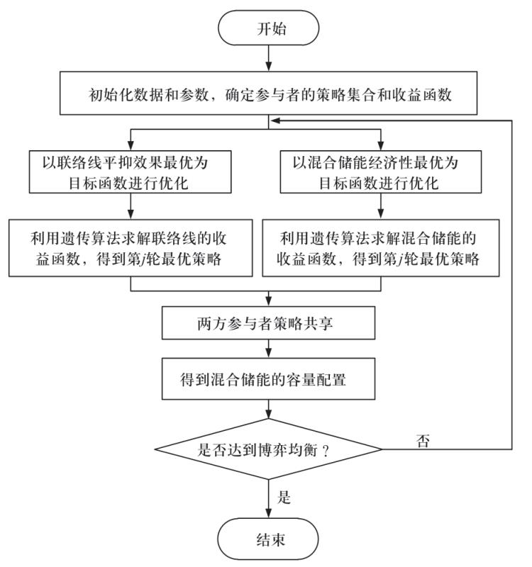 在利用文獻[24]的方法驗證本文Nash均衡解存在且唯一的基礎上,根據(jù)第2章的模型設計思路,建立非合作博弈模型。首先,將鋰電池和超級電容器的功率、容量視為博弈參與者的策略,當參與者獨立優(yōu)化各自目標的優(yōu)化問題時,利用改進的遺傳算法求解收益函數(shù),得到一方的最優(yōu)策略,與另一方目前最優(yōu)策略構成組合策略;其次,以組合策略所對應的適應度函數(shù)值為目標進行不斷迭代,直到Nash均衡解。求解流程如圖3所示。