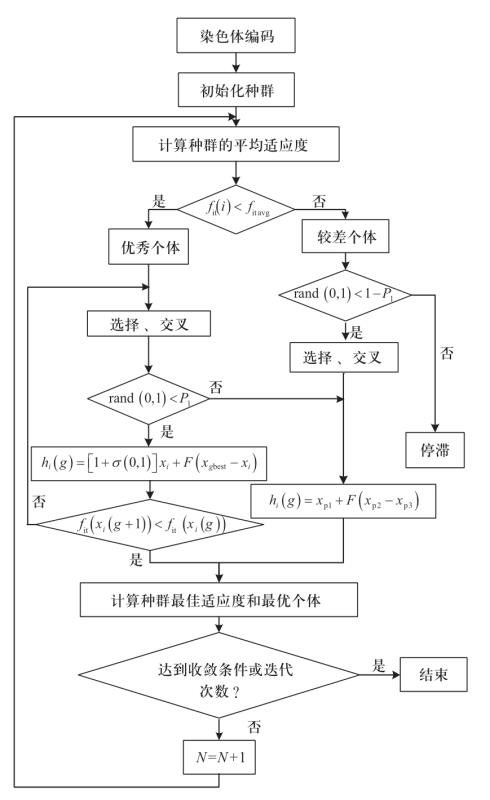 式中:選取fit(i)<fitavg的個體為最優(yōu)個體,剩余為較差個體,共有NP個個體。為了增強算法的局部探索能力并維持種群多樣性,令優(yōu)秀個體進化概率P1=0.9。改進遺傳算法的具體流程如圖2所示。