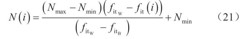 式中:N(i)為個體i產(chǎn)生的后代數(shù);Nmax和Nmin分別為每個個體可產(chǎn)生最大和最小的后代數(shù);fitW和fitB分別為當前種群中個體最差和最好的適應度;fit(i)為個體i的適應度函數(shù)。