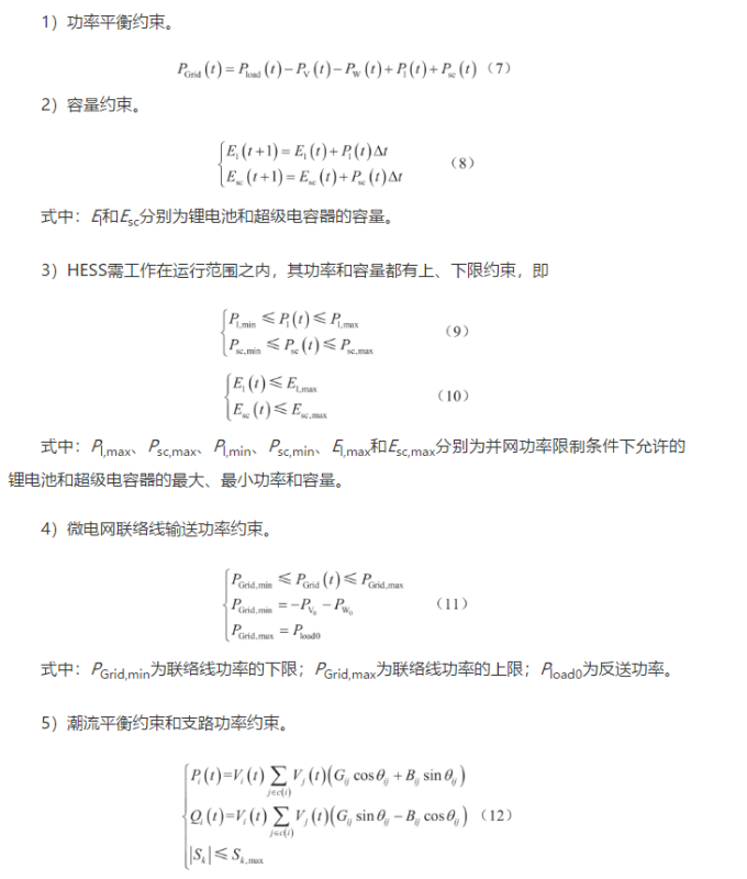 超級電容器、鋰電池和聯(lián)絡線要滿足并網(wǎng)型微電網(wǎng)平衡方程和各自約束[21-22]。