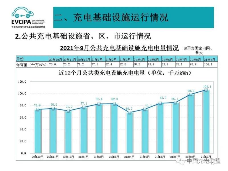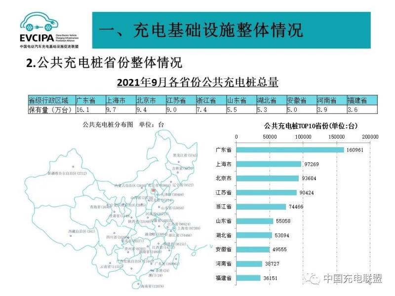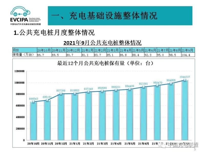 1、公共充電基礎設施運行情況,2021年9月比2021年8月公共充電樁增加5.95萬臺,9月同比增長72.3%。截至2021年9月,聯(lián)盟內(nèi)成員單位總計上報公共類充電樁104.4萬臺,其中直流充電樁42.8萬臺、交流充電樁61.6萬臺、交直流一體充電樁414臺。從2020年10月到2021年9月,月均新增公共類充電樁約3.65萬臺。
