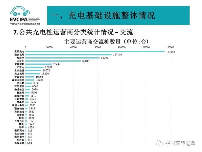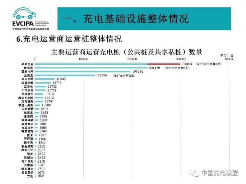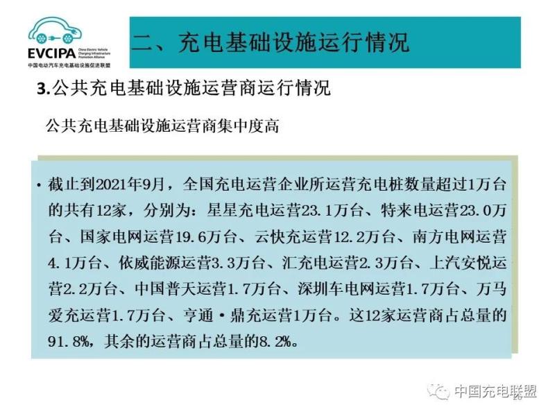 3、公共充電基礎設施運營商運行情況,截止到2021年9月,全國充電運營企業(yè)所運營充電樁數(shù)量超過1萬臺的共有12家,分別為:星星充電運營23.1萬臺、特來電運營23.0萬臺、國家電網(wǎng)運營19.6萬臺、云快充運營12.2萬臺、南方電網(wǎng)運營4.1萬臺、依威能源運營3.3萬臺、匯充電運營2.3萬臺、上汽安悅運營2.2萬臺、中國普天運營1.7萬臺、深圳車電網(wǎng)運營1.7萬臺、萬馬愛充運營1.7萬臺、亨通·鼎充運營1萬臺。這12家運營商占總量的91.8%,其余的運營商占總量的8.2%。