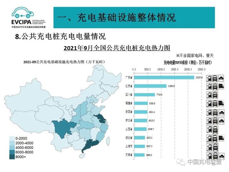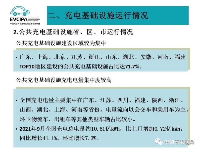 2、公共充電基礎設施省、區(qū)、市運行情況,廣東、上海、北京、江蘇、浙江、山東、湖北、安徽、河南、福建TOP10地區(qū)建設的公共充電基礎設施占比達71.7%。全國充電電量主要集中在廣東、江蘇、四川、福建、陜西、浙江、山西、湖北、上海、河南等省份,電量流向以公交車和乘用車為主,環(huán)衛(wèi)物流車、出租車等其他類型車輛占比較小。2021年9月全國充電總電量約10.61億kWh,比上月增加0.72億kWh,同比增長41.1%,環(huán)比增長7.3%。