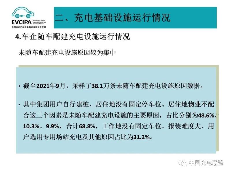 4、車企隨車配建充電設施運行情況,截至2021年9月,采樣了38.1萬條未隨車配建充電設施原因數(shù)據(jù)。其中集團用戶自行建樁、居住地沒有固定停車位、居住地物業(yè)不配合這三個因素是未隨車配建充電設施的主要原因,占比分別為48.6%、10.3%、9.9%,合計68.8%,工作地沒有固定車位、報裝難度大、用戶選用專用場站充電及其他原因占比為31.2%。