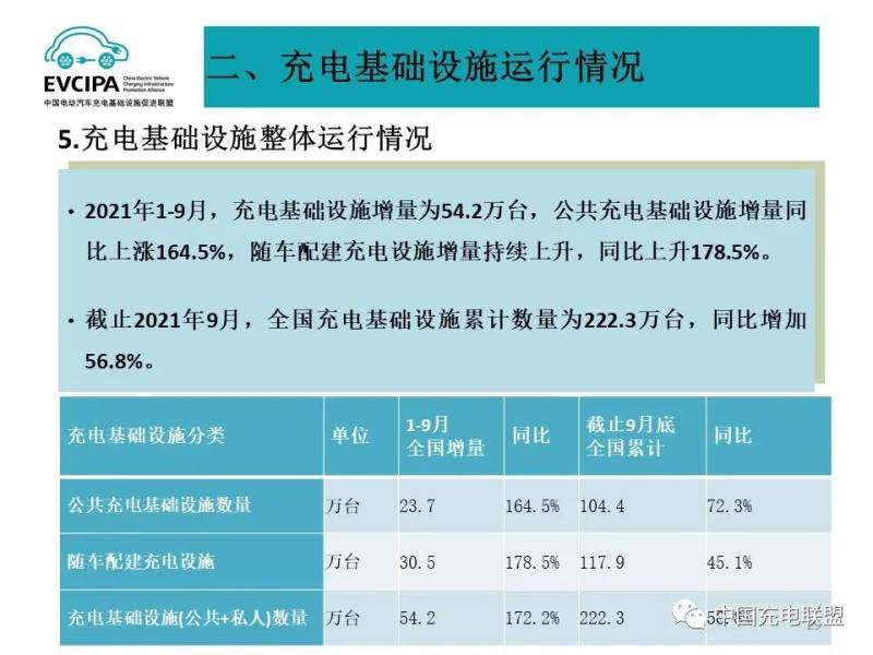 5、充電基礎設施整體運行情況,2021年1-9月,充電基礎設施增量為54.2萬臺,公共充電基礎設施增量同比上漲164.5%,隨車配建充電設施增量持續(xù)上升,同比上升178.5%。截止2021年9月,全國充電基礎設施累計數(shù)量為222.3萬臺,同比增加56.8%。
