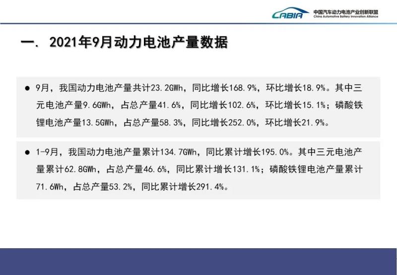產(chǎn)量方面,2021年9月,我國(guó)動(dòng)力電池產(chǎn)量共計(jì)23.2GWh,同比增長(zhǎng)168.9%,環(huán)比增長(zhǎng)18.9%。其中三元電池產(chǎn)量9.6GWh,占總產(chǎn)量41.6%,同比增長(zhǎng)102.6%,環(huán)比增長(zhǎng)15.1%;磷酸鐵鋰電池產(chǎn)量13.5GWh,占總產(chǎn)量58.3%,同比增長(zhǎng)252.0%,環(huán)比增長(zhǎng)21.9%。l1-9月,我國(guó)動(dòng)力電池產(chǎn)量累計(jì)134.7GWh,同比累計(jì)增長(zhǎng)195.0%。其中三元電池產(chǎn)量累計(jì)62.8GWh,占總產(chǎn)量46.6%,同比累計(jì)增長(zhǎng)131.1%;磷酸鐵鋰電池產(chǎn)量累計(jì)71.6Wh,占總產(chǎn)量53.2%,同比累計(jì)增長(zhǎng)291.4%。