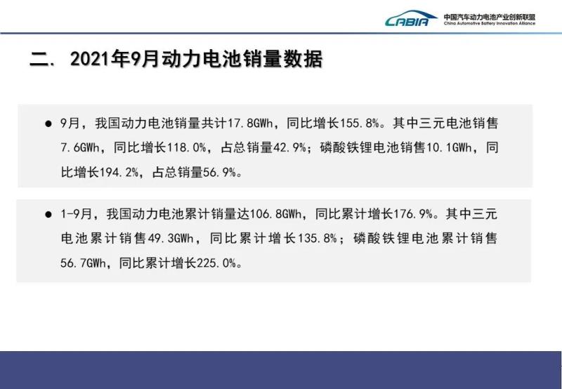 銷量方面:2021年9月,我國(guó)動(dòng)力電池銷量共計(jì)17.8GWh,同比增長(zhǎng)155.8%。其中三元電池銷售7.6GWh,同比增長(zhǎng)118.0%,占總銷量42.9%;磷酸鐵鋰電池銷售10.1GWh,同比增長(zhǎng)194.2%,占總銷量56.9%。1-9月,我國(guó)動(dòng)力電池累計(jì)銷量達(dá)106.8GWh,同比累計(jì)增長(zhǎng)176.9%。其中三元電池累計(jì)銷售49.3GWh,同比累計(jì)增長(zhǎng)135.8%;磷酸鐵鋰電池累計(jì)銷售56.7GWh,同比累計(jì)增長(zhǎng)225.0%。