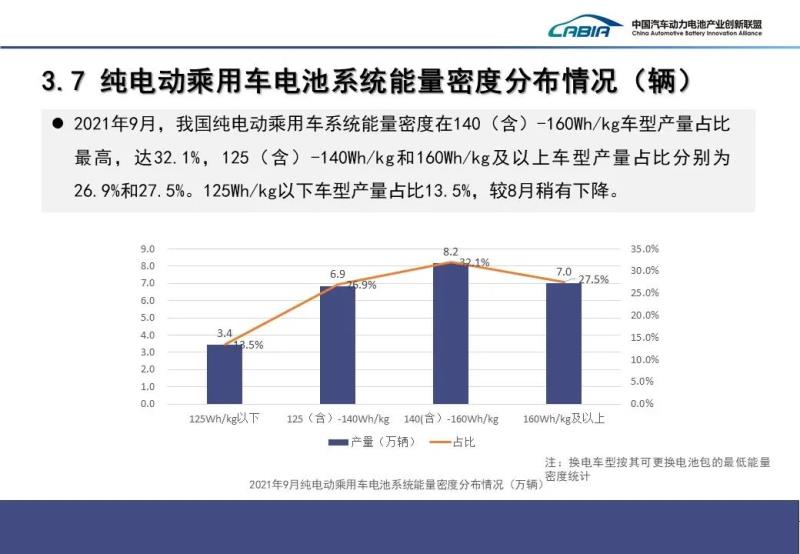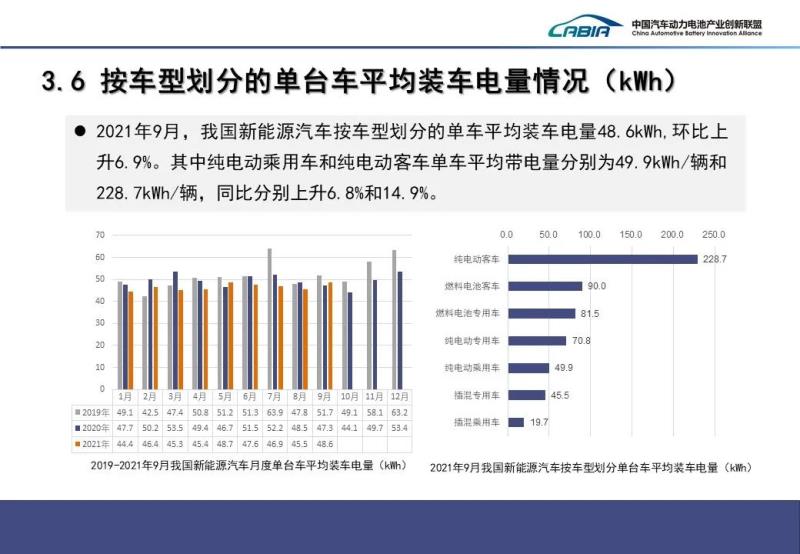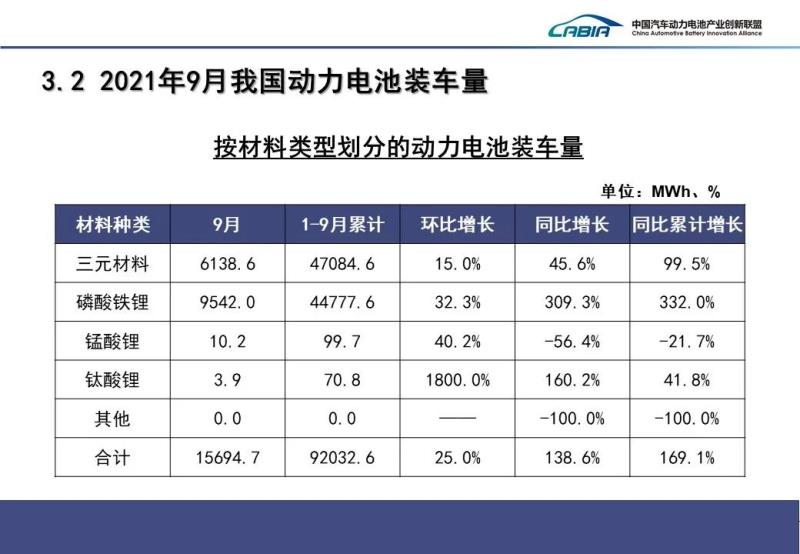 裝車量方面,2021年9月,我國(guó)動(dòng)力電池裝車量15.7GWh,同比上升138.6%,環(huán)比上升25.0%。其中三元電池共計(jì)裝車6.1GWh,同比上升45.6%,環(huán)比上升15.0%;磷酸鐵鋰電池共計(jì)裝車9.5GWh,同比上升309.3%,環(huán)比上升32.3%。1-9月,我國(guó)動(dòng)力電池裝車量累計(jì)92.0GWh,同比累計(jì)上升169.1%。其中三元電池裝車量累計(jì)47.1GWh,占總裝車量51.2%,同比累計(jì)上升99.5%;磷酸鐵鋰電池裝車量累計(jì)44.8GWh,占總裝車量48.7%,同比累計(jì)上升332.0%。
