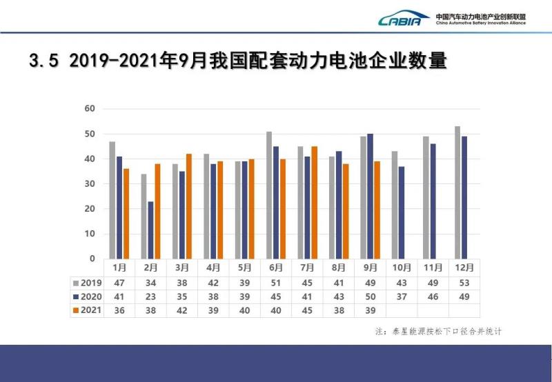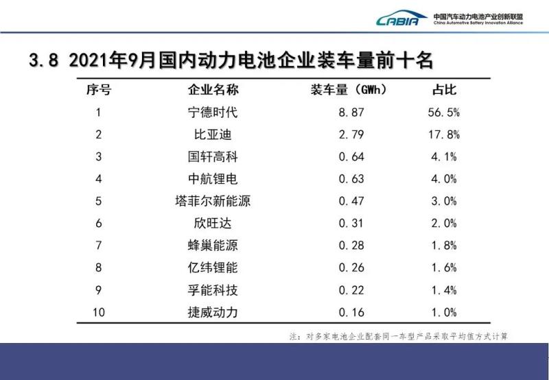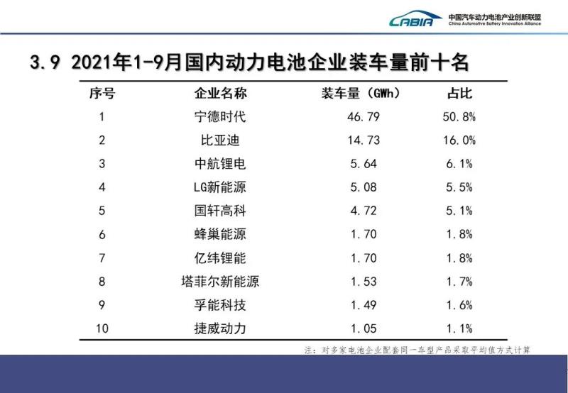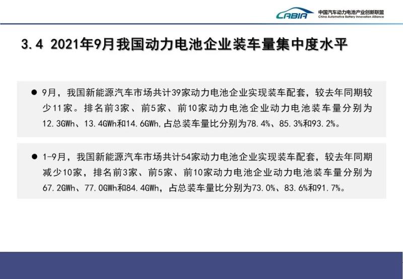 2021年9月,我國(guó)新能源汽車市場(chǎng)共計(jì)39家動(dòng)力電池企業(yè)實(shí)現(xiàn)裝車配套,較去年同期較少11家。排名前3家、前5家、前10家動(dòng)力電池企業(yè)動(dòng)力電池裝車量分別為12.3GWh、13.4GWh和14.6GWh,占總裝車量比分別為78.4%、85.3%和93.2%。1-9月,我國(guó)新能源汽車市場(chǎng)共計(jì)54家動(dòng)力電池企業(yè)實(shí)現(xiàn)裝車配套,較去年同期減少10家,排名前3家、前5家、前10家動(dòng)力電池企業(yè)動(dòng)力電池裝車量分別為67.2GWh、77.0GWh和84.4GWh,占總裝車量比分別為73.0%、83.6%和91.7%。