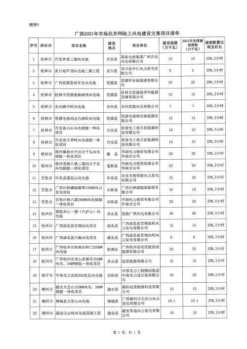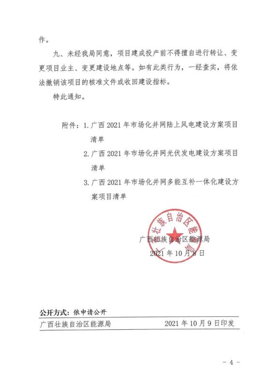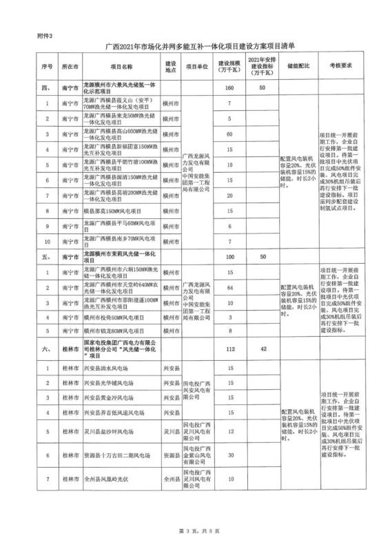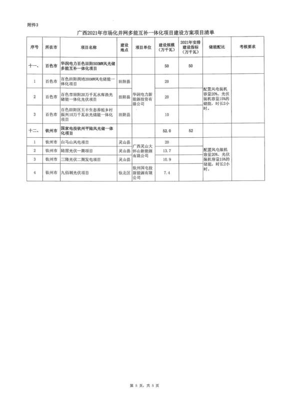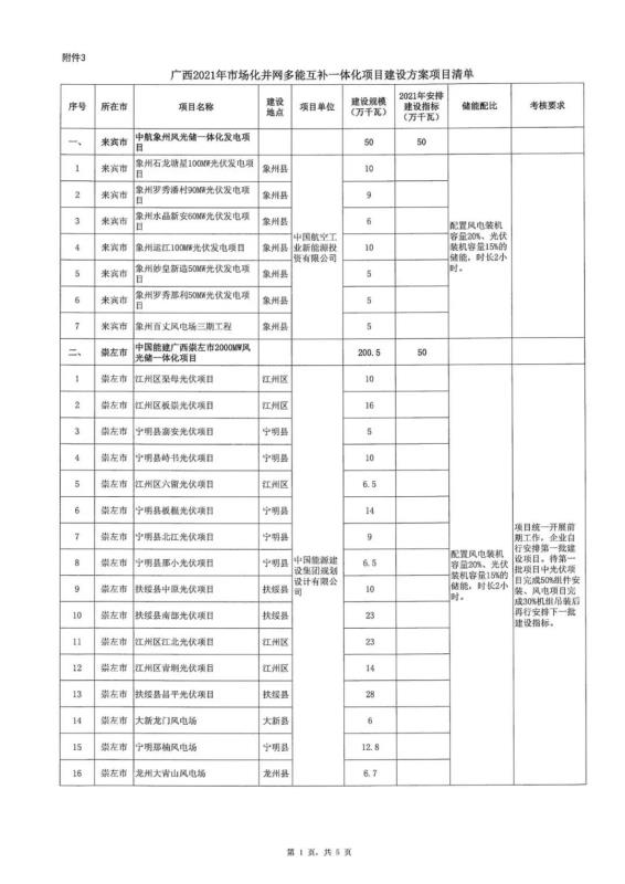 中國(guó)儲(chǔ)能網(wǎng)訊:10月9日,廣西壯族自治區(qū)能源局印發(fā)《2021年市場(chǎng)化并網(wǎng)陸上風(fēng)電、光伏發(fā)電及多能互補(bǔ)一體化項(xiàng)目建設(shè)方案的通知》。通知中顯示陸上風(fēng)電建設(shè)方案的項(xiàng)目,配20%*2h儲(chǔ)能;2021光伏發(fā)電建設(shè)方案的項(xiàng)目,配15%*2h儲(chǔ)能。合計(jì)儲(chǔ)能需求1145.6MW/2291.2MWh。