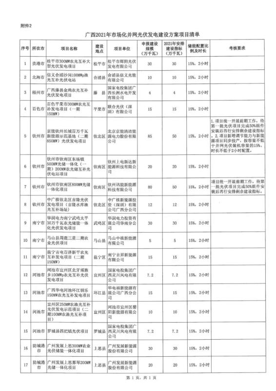 列入2021年市場(chǎng)化并網(wǎng)光伏發(fā)電建設(shè)方案的項(xiàng)目共17個(gè),總規(guī)模395.4萬(wàn)千瓦,2021年安排330.4萬(wàn)千瓦,配儲(chǔ)能495.6MW/991.2MWh;