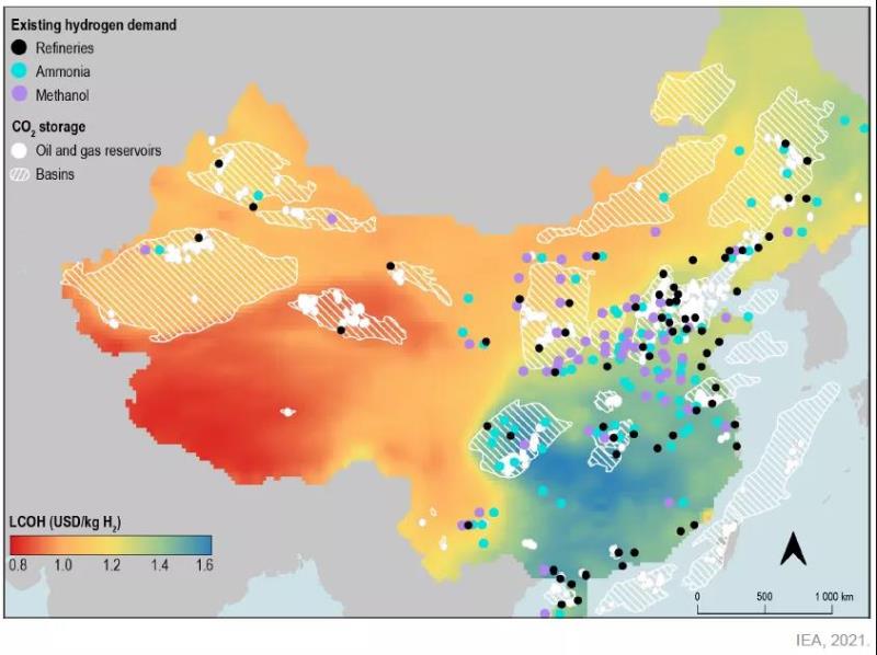 ? 圖10 中國現(xiàn)有氫能需求、可再生制氫的成本與潛在的二氧化碳封存地點(diǎn)