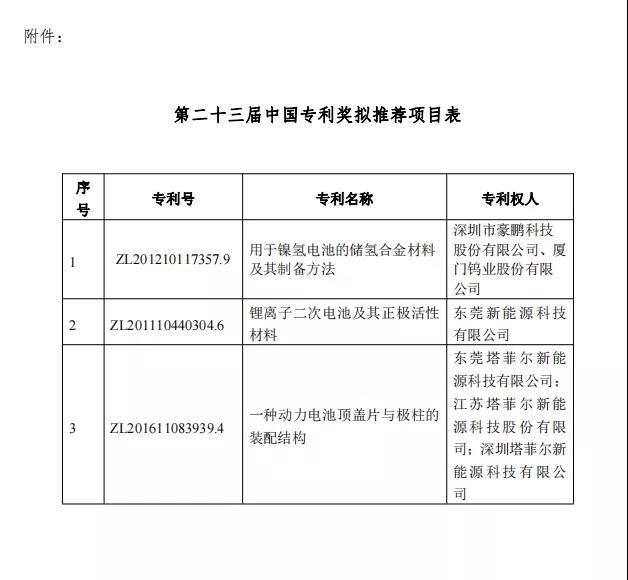 中國化學(xué)與物理電源行業(yè)協(xié)會按照《國家知識產(chǎn)權(quán)局關(guān)于評選第二十三屆中國專利獎的通知》(國知發(fā)運(yùn)函字〔2021〕124號)要求,協(xié)會組織專家評審,擬推薦三項(xiàng)專利申報“第二十三屆中國專利獎”?,F(xiàn)將擬推薦參評項(xiàng)目進(jìn)行公示,公示期為2021年10月18日至10月22日。公示期內(nèi),如有異議,請以書面形式向協(xié)會提出,并提供必要證明材料,異議應(yīng)當(dāng)簽署真實(shí)姓名或加蓋單位公章,注明聯(lián)系方式。超出期限或匿名的異議不予受理。