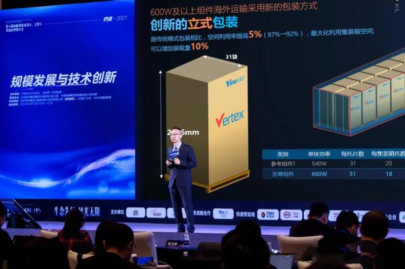 天合光能全球市場(chǎng)與產(chǎn)品負(fù)責(zé)人張映斌博士介紹稱(chēng),海外以集裝箱運(yùn)輸為主,受集裝箱2.58米的門(mén)高所限,行業(yè)有聲音認(rèn)為組件寬度將被限制在1.135米以?xún)?nèi),不可逾越。但事實(shí)上,天合光能不僅打破了尺寸桎梏,技術(shù)工程團(tuán)隊(duì)經(jīng)過(guò)廣泛調(diào)研、深度研究,更一舉打破包裝傳統(tǒng),創(chuàng)新開(kāi)發(fā)了立式包裝解決方案:和傳統(tǒng)橫式包裝相比,可以增加裝載量10%,集裝箱空間利用率提高5%,最大化利用集裝箱空間。在海運(yùn)費(fèi)用節(jié)節(jié)攀升的大背景下,假如從中國(guó)到歐洲,以現(xiàn)在主流價(jià)格1萬(wàn)美元每箱的運(yùn)費(fèi)為例,換算成人民幣,創(chuàng)新包裝可節(jié)約運(yùn)費(fèi)2分錢(qián)每瓦!