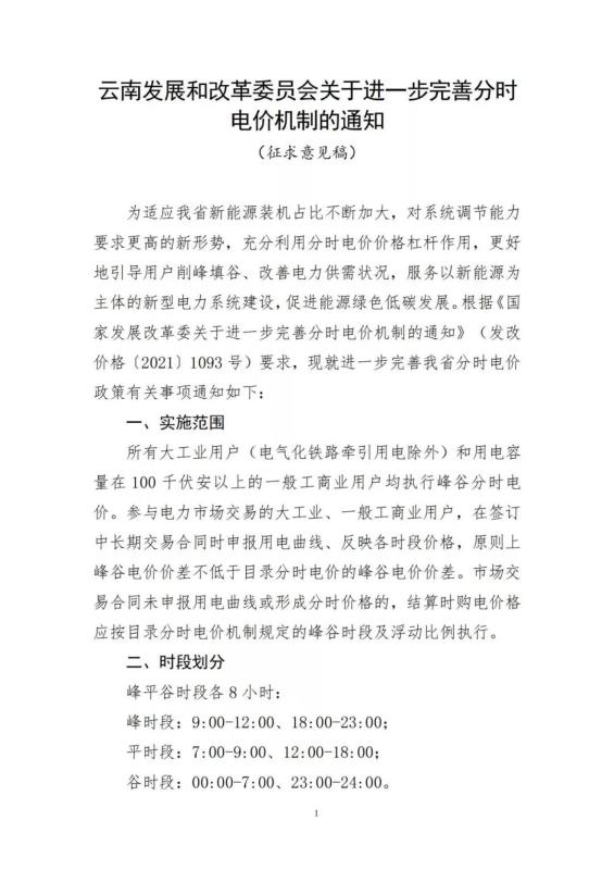 云南省發(fā)展和改革委員會(huì)向社會(huì)公開(kāi)征求《關(guān)于進(jìn)一步完善分時(shí)電價(jià)機(jī)制的通知(征求意見(jiàn)稿)》意見(jiàn)的公告