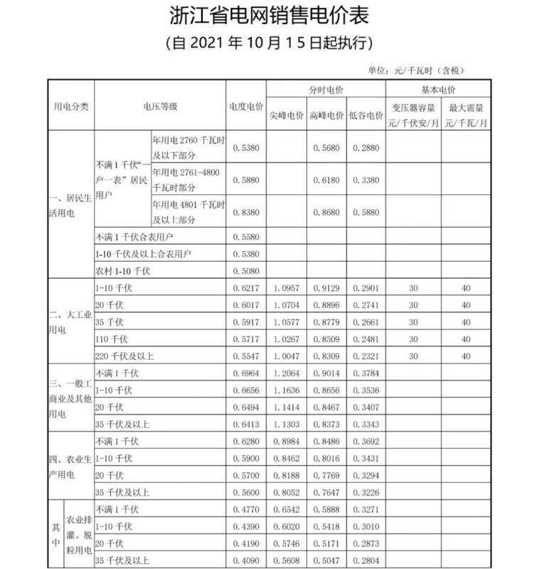 附表:浙江省電網(wǎng)銷售電價(jià)表