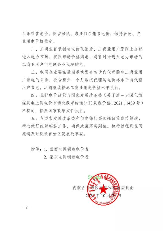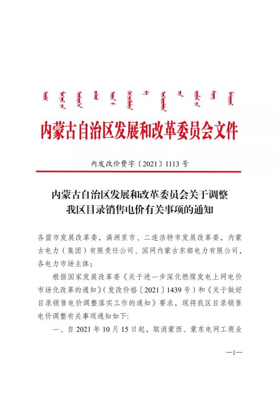 內(nèi)蒙:關(guān)于調(diào)整我區(qū)目錄銷售電價有關(guān)事項的通知