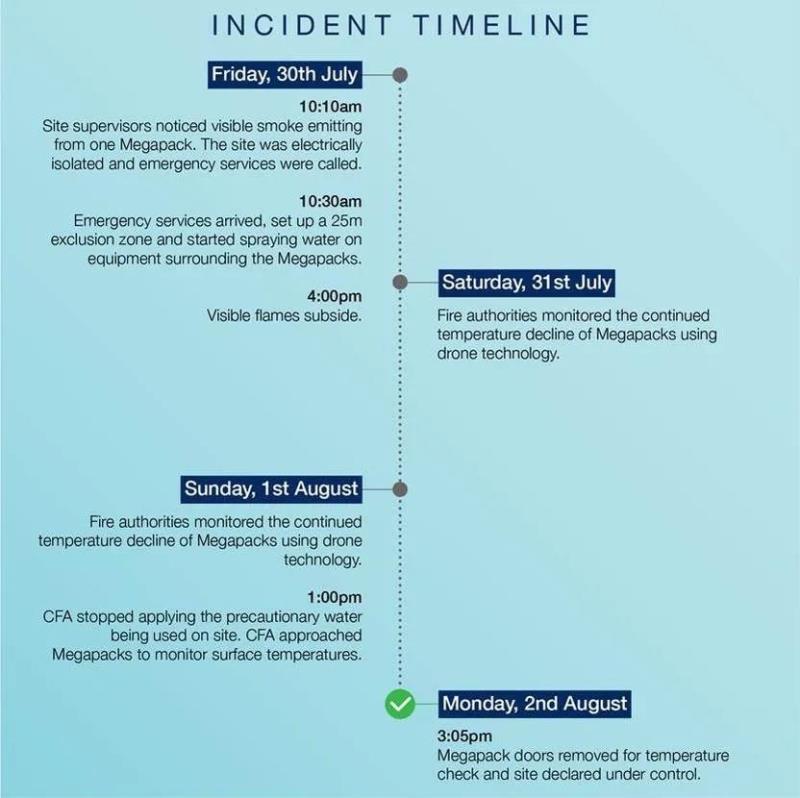 事故發(fā)生后,事發(fā)地的控制權(quán)交給了維多利亞能源安全局,項目運營商法國可再生能源巨頭Neoen、承包商UGL Engineering、以及設(shè)備供應(yīng)商特斯拉配合與其一起開展事件原因調(diào)查、研究采取哪些措施以避免事故再次發(fā)生。