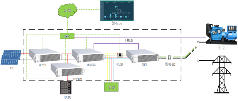 SolarE-60kW光儲一體機包括電池直掛和非電池直掛兩系列產品,針對小型工商業(yè)、別墅區(qū)等應用場景定制開發(fā),電池、光伏、電網(wǎng)、負載接入;系統(tǒng)含STS裝置,具備并離網(wǎng)毫秒級切換能力;強大的帶載能力,具備100%三相不平衡帶載能力,支持通用模式、微網(wǎng)模式、儲能模式、指令等多種運行模式。支持接入遠程監(jiān)控系統(tǒng),實現(xiàn)實時監(jiān)控。擴展能力強支持柴油機旁路控制、風機接入等,系統(tǒng)方案圖如下: