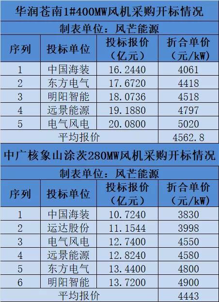 中廣核象山涂茨280MW海上風(fēng)電項目風(fēng)機采購共有6家整機商競標,平均投標報價4443元/kW。
