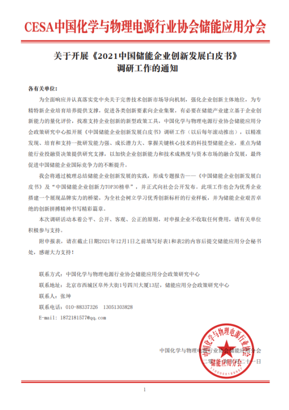 關于開展《2021中國儲能企業(yè)創(chuàng)新發(fā)展白皮書》調研工作的通知