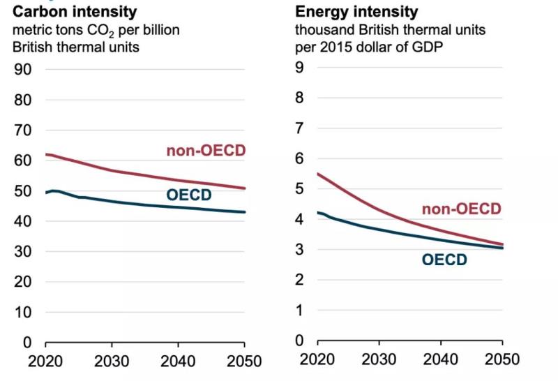 EIA還預(yù)測(cè),到2050年全球能源強(qiáng)度(即每美元GDP消耗的能源)將下降。在許多經(jīng)濟(jì)體中,受技術(shù)和能源密集型產(chǎn)業(yè)轉(zhuǎn)移的驅(qū)動(dòng),能源效率的提高導(dǎo)致了能源強(qiáng)度的降低。在非經(jīng)合組織區(qū)域,經(jīng)濟(jì)增長(zhǎng)導(dǎo)致能源強(qiáng)度的下降速度快于經(jīng)合組織區(qū)域。到2050年,經(jīng)合組織和非經(jīng)合組織國(guó)家的能源強(qiáng)度變得更加接近,因?yàn)橐恍┓墙?jīng)合組織國(guó)家增加了其在能源密集度較低的行業(yè)中的份額,其技術(shù)使用也變得更加類(lèi)似于經(jīng)合組織國(guó)家。