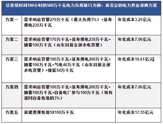 《報(bào)告》假設(shè)山東省存在500萬千瓦的尖峰負(fù)荷供應(yīng)缺口,設(shè)定5種電力供應(yīng)保障方案,通過計(jì)算這5種方案不同的負(fù)荷持續(xù)時(shí)間的資源年化總成本來比較不同方案的經(jīng)濟(jì)性。研究結(jié)果顯示,以持續(xù)時(shí)間100小時(shí)的500萬千瓦電力負(fù)荷缺口為例, “需求響應(yīng)(270萬千瓦)+延壽煤電(230萬千瓦)”方案的年化成本最低,為3.25億元;“新建燃煤機(jī)組5x100萬千瓦”方案的年化成本最高,為17.55億元,其中固定成本高達(dá)16億元。
