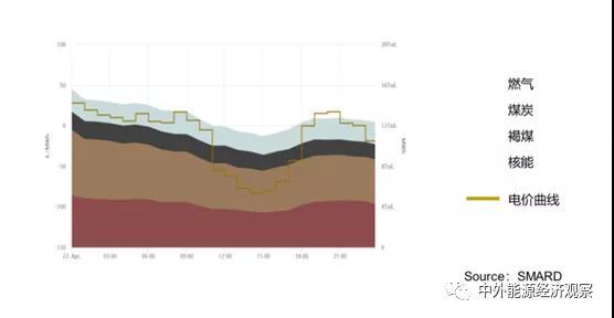歐洲尤其是德國隨著可再生能源比例增加,現(xiàn)貨市場上出現(xiàn)負電價的時候越來越多,主要出現(xiàn)在風電和光伏發(fā)電同時達到最高峰的時候,也就是發(fā)電過剩的時候。