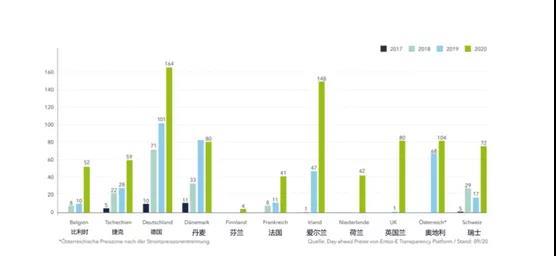 歐洲各國都出現(xiàn)過負電價,而且是逐年增多。德國2019年有101小時出現(xiàn)過負電價,2020年9月份已經(jīng)達到164小時。