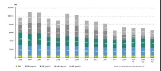 圖一:德國輸電公司平衡功率的招標情況,其中PRL為一次調(diào)頻功率,SRL為二次調(diào)頻功率,MRL為三次調(diào)頻功率