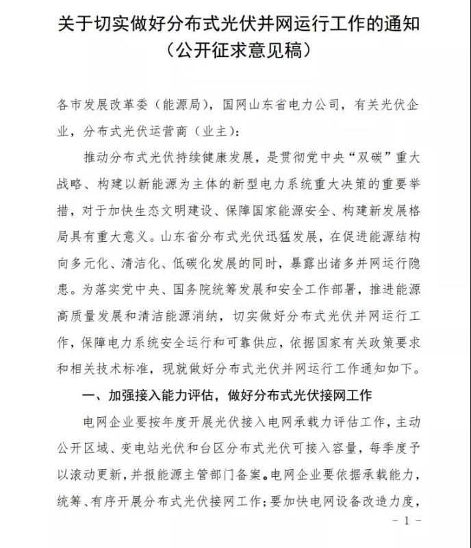 10月22日,國(guó)家能源局山東監(jiān)管辦公室發(fā)布關(guān)于《關(guān)于切實(shí)做好分布式光伏并網(wǎng)運(yùn)行管理的通知》公開(kāi)征求意見(jiàn)的公告。文件指出,為落實(shí)黨中央、國(guó)務(wù)院統(tǒng)籌發(fā)展和安全工作部署,推進(jìn)能源高質(zhì)量發(fā)展和清潔能源消納,切實(shí)做好分布式光伏并網(wǎng)運(yùn)行工作,保障電力系統(tǒng)安全運(yùn)行和可靠供應(yīng),依據(jù)國(guó)家有關(guān)政策要求和相關(guān)技術(shù)標(biāo)準(zhǔn),現(xiàn)就做好分布式光伏并網(wǎng)運(yùn)行工作通知如下。