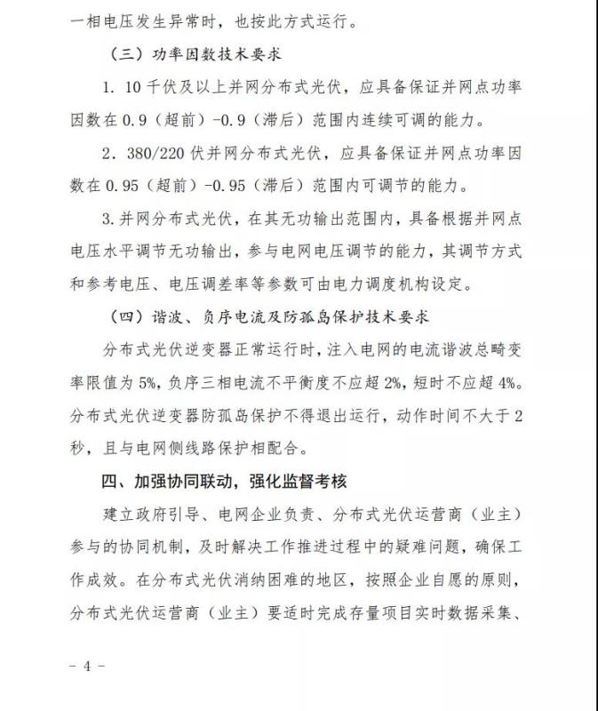 文件明確,建立政府引導(dǎo)、電網(wǎng)企業(yè)負(fù)責(zé)、分布式光伏運(yùn)營(yíng)商(業(yè)主)參與的協(xié)同機(jī)制,及時(shí)解決工作推進(jìn)過(guò)程中的疑難問(wèn)題,確保工作成效。在分布式光伏消納困難的地區(qū),按照企業(yè)自愿的原則,分布式光伏運(yùn)營(yíng)商(業(yè)主)要適時(shí)完成存量項(xiàng)目實(shí)時(shí)數(shù)據(jù)采集、功率控制及技術(shù)參數(shù)整改工作;增量項(xiàng)目滿足要求后并網(wǎng)運(yùn)行。