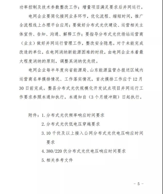 值得注意的是,電網(wǎng)企業(yè)每半年度向省能源局、山東能源監(jiān)管辦報(bào)送區(qū)域內(nèi)運(yùn)營(yíng)商名單摸排情況、工作落實(shí)情況,首次摸排工作應(yīng)于12月30日前完成。整縣分布式光伏規(guī)?;_(kāi)發(fā)試點(diǎn)項(xiàng)目并網(wǎng)運(yùn)行工作要求參照本通知執(zhí)行。本通知自(3個(gè)月緩沖期)日起執(zhí)行。