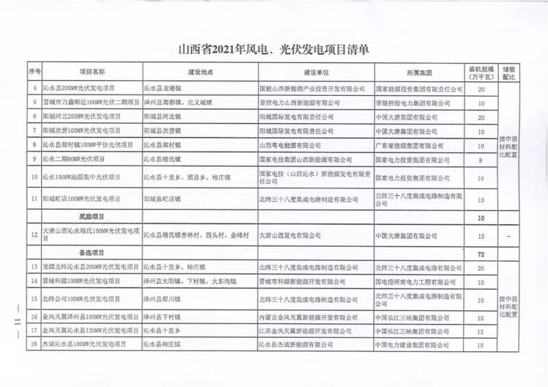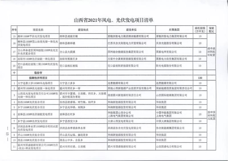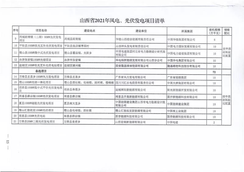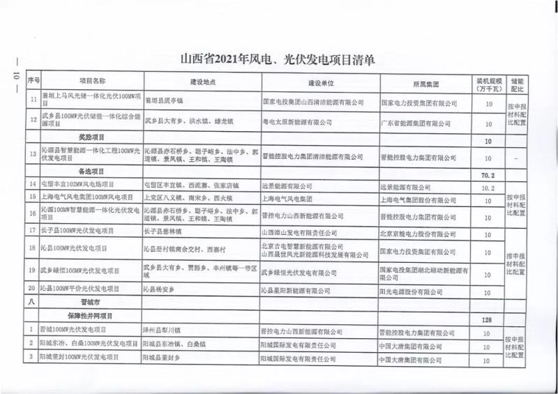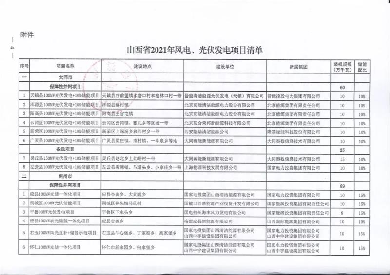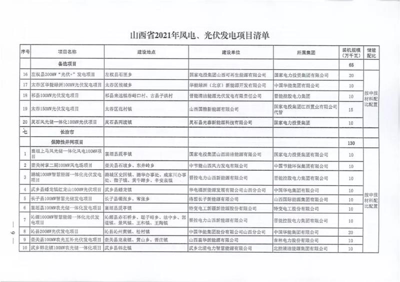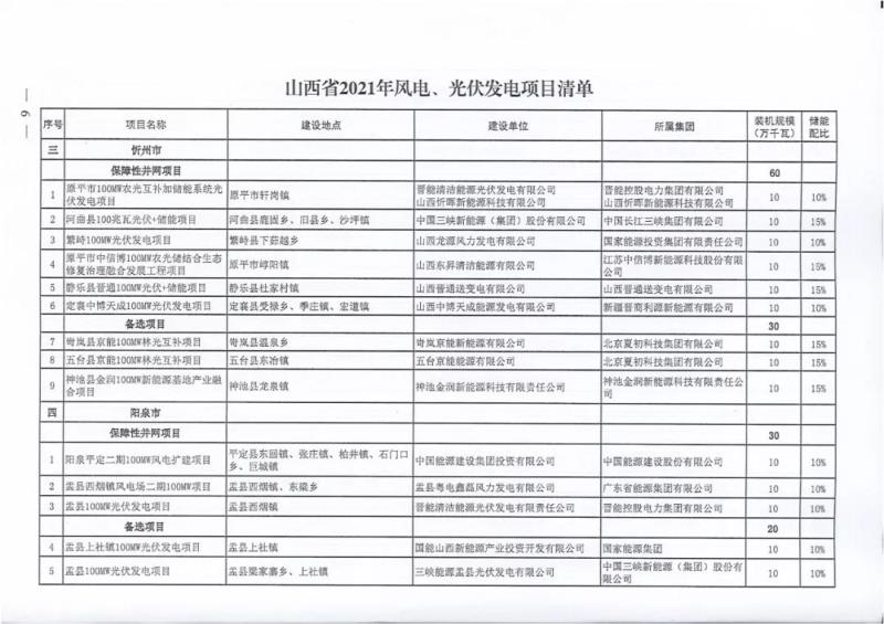 中國(guó)儲(chǔ)能網(wǎng)訊:10月22日,山西正式2021年度風(fēng)電、光伏發(fā)電保障性并網(wǎng)年度建設(shè)計(jì)劃。風(fēng)、光合計(jì)17.792GW,其中保障性11.2GW+獎(jiǎng)勵(lì)700MW+備選5.892GW(山西下發(fā)9.71GW光伏保障項(xiàng)目(另備選4.95GW),配10%-15%儲(chǔ)能,文件明確保障性規(guī)模與獎(jiǎng)勵(lì)規(guī)模可同步開展前期工作,優(yōu)先保證保障性并網(wǎng)項(xiàng)目和獎(jiǎng)勵(lì)項(xiàng)目并網(wǎng),如上述項(xiàng)目未能按承諾時(shí)間并網(wǎng),將視項(xiàng)目成熟度、建設(shè)進(jìn)度和接入條件等,從備選項(xiàng)目中選擇并網(wǎng)項(xiàng)目,保障完成國(guó)家下達(dá)的最低消納責(zé)任權(quán)重。