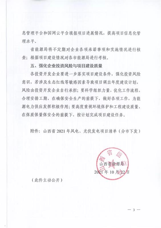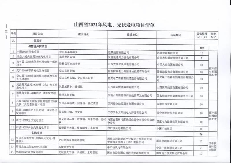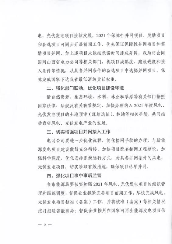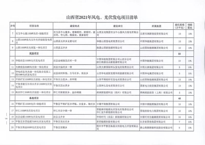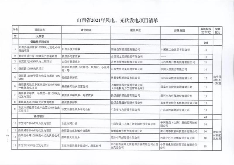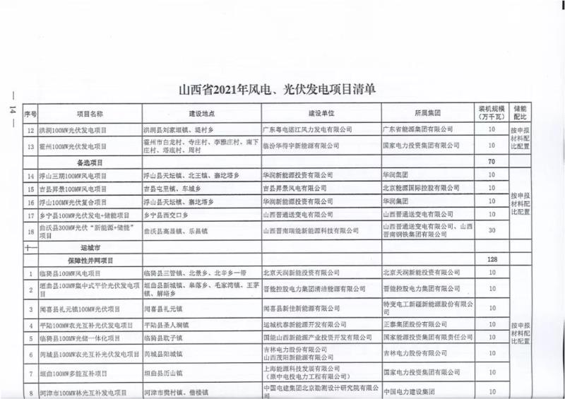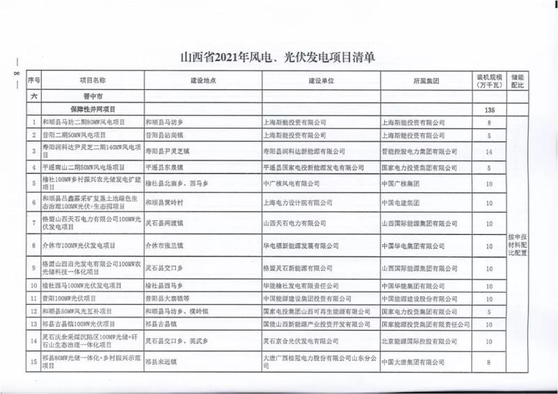中國(guó)儲(chǔ)能網(wǎng)訊:10月22日,山西正式2021年度風(fēng)電、光伏發(fā)電保障性并網(wǎng)年度建設(shè)計(jì)劃。風(fēng)、光合計(jì)17.792GW,其中保障性11.2GW+獎(jiǎng)勵(lì)700MW+備選5.892GW(山西下發(fā)9.71GW光伏保障項(xiàng)目(另備選4.95GW),配10%-15%儲(chǔ)能,文件明確保障性規(guī)模與獎(jiǎng)勵(lì)規(guī)模可同步開展前期工作,優(yōu)先保證保障性并網(wǎng)項(xiàng)目和獎(jiǎng)勵(lì)項(xiàng)目并網(wǎng),如上述項(xiàng)目未能按承諾時(shí)間并網(wǎng),將視項(xiàng)目成熟度、建設(shè)進(jìn)度和接入條件等,從備選項(xiàng)目中選擇并網(wǎng)項(xiàng)目,保障完成國(guó)家下達(dá)的最低消納責(zé)任權(quán)重。