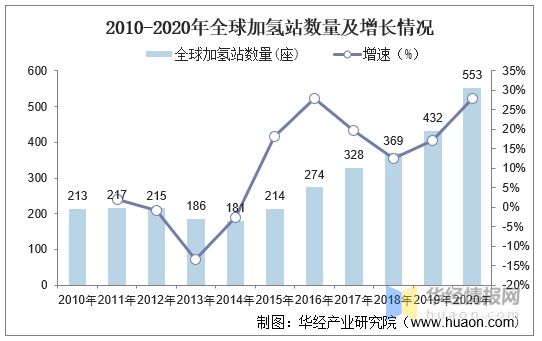 加氫站是氫能產(chǎn)業(yè)發(fā)展的重要環(huán)節(jié)。近年來全球加氫站的數(shù)量不斷增長,2010至2020年,全球加氫站數(shù)量從213座增加至553座,年均復(fù)合增長率為10%。