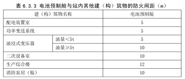 6.2.1 儲(chǔ)能電站內(nèi),電池預(yù)制艙布置區(qū)域應(yīng)集中布置,與其他功能區(qū)域分開,防火間距不應(yīng)小于本標(biāo) 準(zhǔn) 6.3 的規(guī)定。