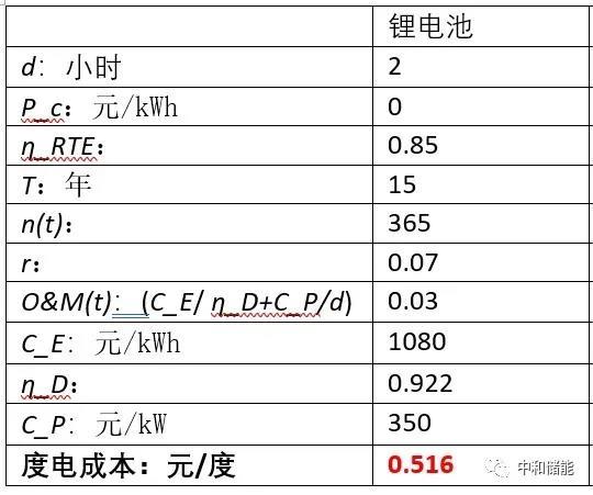 使用以上公式,我們對(duì)一個(gè)鋰電池儲(chǔ)能系統(tǒng)進(jìn)行度電成本計(jì)算。各參數(shù)如下圖所示,假設(shè)該系統(tǒng)用于發(fā)電側(cè)每天循環(huán)一次,即使使用15年,全壽命度電成本依然高達(dá)0.516元/度。由此,不難想象為什么目前發(fā)電側(cè)依然沒有太大的動(dòng)力來積極主動(dòng)建設(shè)儲(chǔ)能系統(tǒng)了。