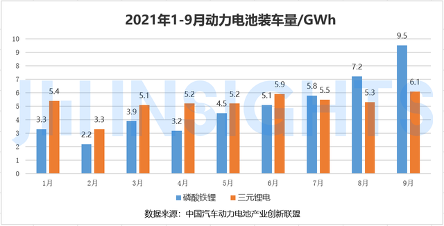 總體而言,2021年1-9月,磷酸鐵鋰裝車量累計44.8GWh,占總裝車量48.7%。以上數據都充分表明,磷酸鐵鋰在新能源汽車領域再次占據上風,而且全年裝車量有望進一步增長,最終趕超三元鋰電。同時,基于新能源汽車的市場規(guī)模,以及磷酸鐵鋰的技術特點,集微咨詢(JW insights)認為,未來,磷酸鐵鋰重回主戰(zhàn)場是大勢所趨。