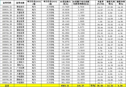從當(dāng)前統(tǒng)計的27家火力發(fā)電中,平均市盈率(TTM)僅30.5倍,平均毛利率和凈利率分別為12.32%和5.59%;相比之下,風(fēng)力發(fā)電公司的平均市盈率(TTM)為59.2倍,光伏發(fā)電企業(yè)的平均市盈率(TTM)高達227.9倍,水利發(fā)電的平均市盈率也超過了火力發(fā)電,達到了63倍;很明顯,當(dāng)前火力發(fā)電由于概念題材和行業(yè)預(yù)期較低,又疊加了煤炭價格上漲擠壓電廠利潤,導(dǎo)致了低估值的區(qū)間。中長期來看,火電板塊的利潤改善加新能源轉(zhuǎn)型的企業(yè)大概率將獲得價值重估。