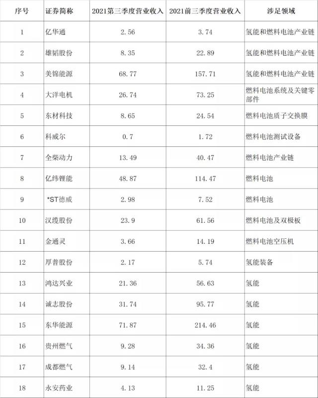 當前滬深兩市上市公司的三季報正在密集披露中。今年前三季度,涉足氫能的上市公司交出的成績單“含金量”如何?高工氫電整理出18家上市公司的三季報,從第三季度及前三季度的營業(yè)收入可以反映出這些上市公司的經(jīng)營概況: