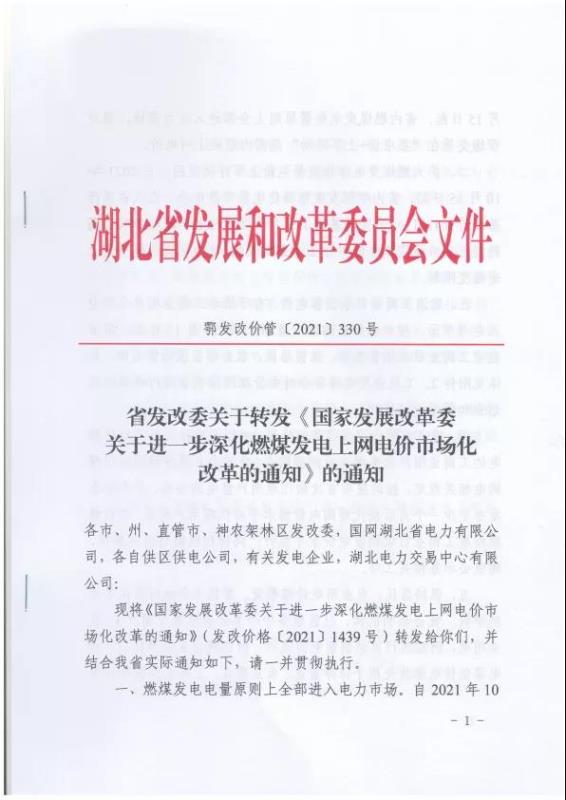 湖北:關(guān)于轉(zhuǎn)發(fā)《國(guó)家發(fā)展改革委關(guān)于進(jìn)一步深化燃煤發(fā)電上網(wǎng)電價(jià)市場(chǎng)化改革的通知》的通知